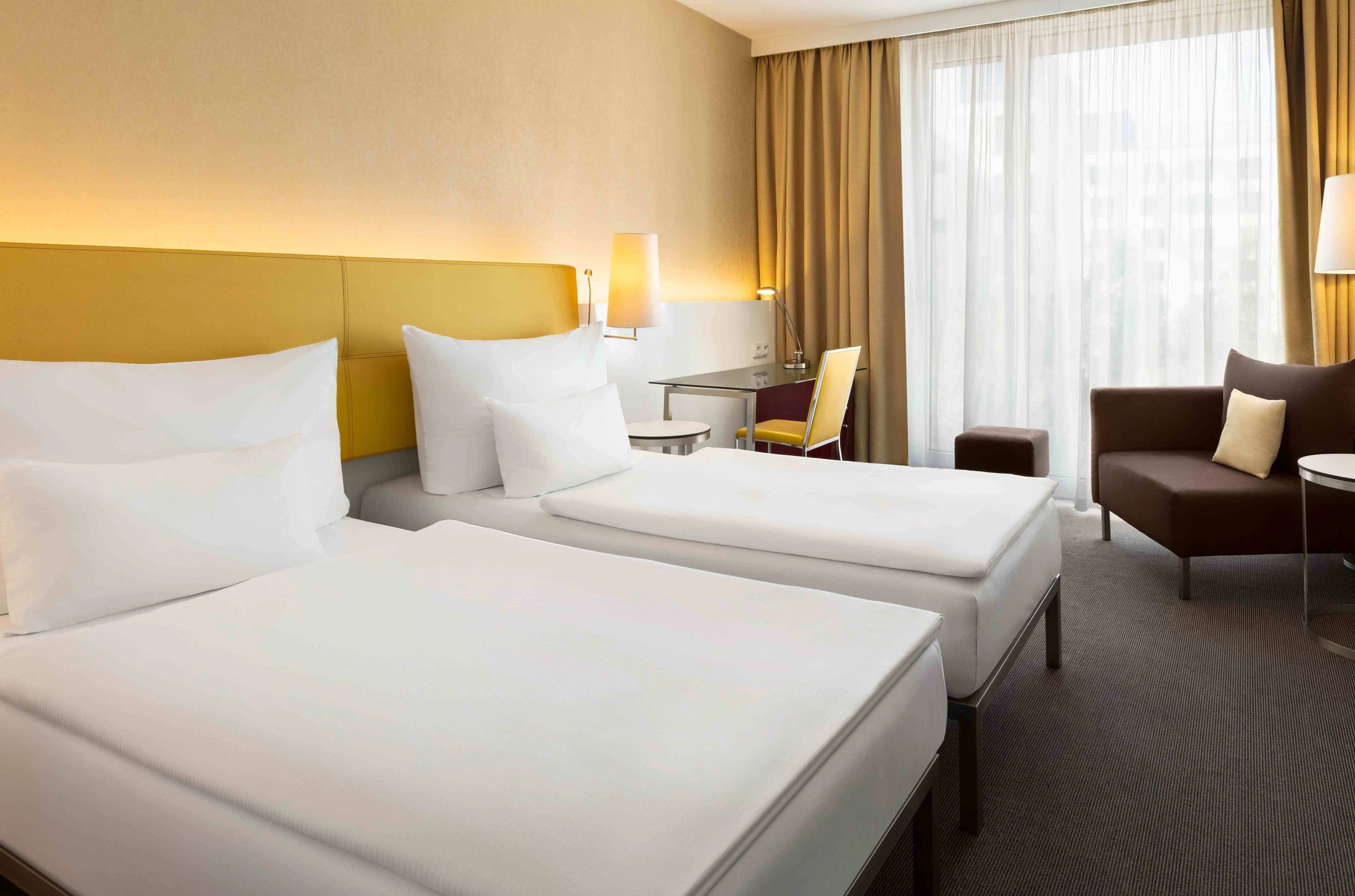 The room offers two comfortable 90×200 cm beds, air conditioning, high-speed Wi-Fi, minibar, safe and satellite TV with premium channels. The bathroom has a combination bathtub and shower, bathroom amenities, hairdryer, bathrobe and slippers. Guests can use the Executive Hub on the 5th floor for the duration of their stay. Rooms can be connected on request.